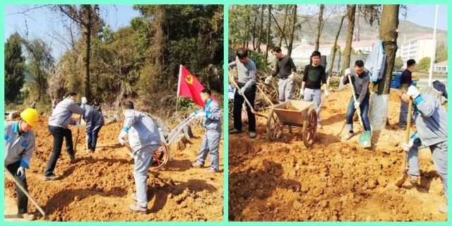 桑植公司員工正在石灰石堆場邊挖樹坑