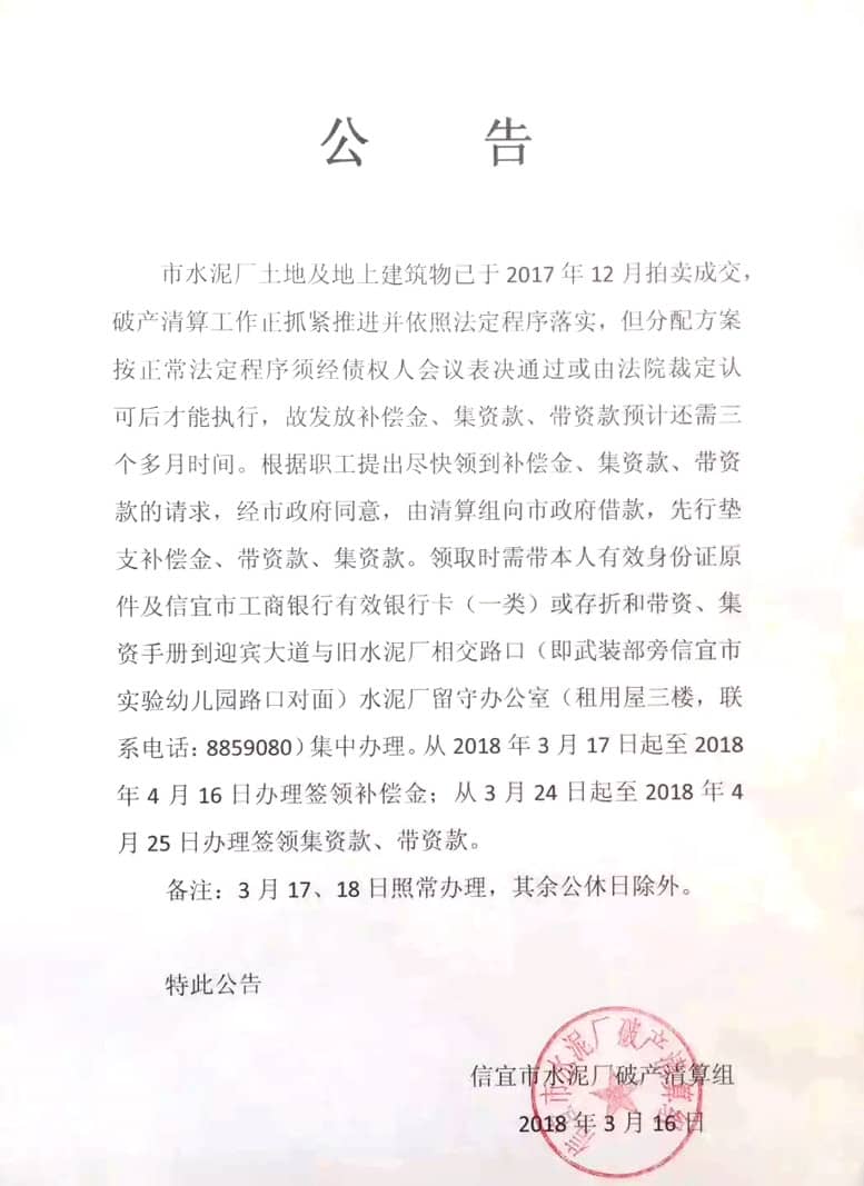 根據(jù)有關(guān)法律、法規(guī),清算組對水泥廠破產(chǎn)后的職工補償情況等進(jìn)行了調(diào)查,并列出職工補償清單于2017年12月21日予以公示和核對。