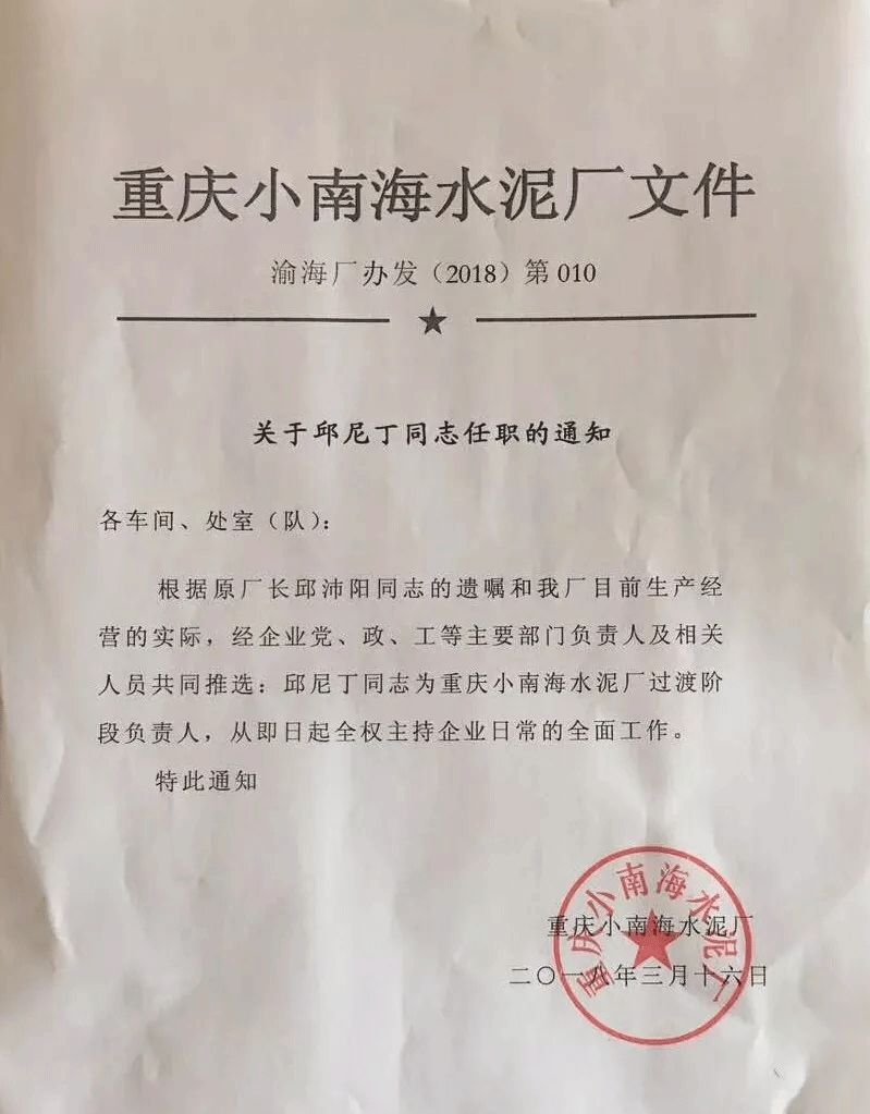 【水泥人網(wǎng)】2018年03月16日,重慶小南海水泥廠廠辦發(fā)布(2018)第010文件:根據(jù)原廠長邱沛陽同志的遺囑,并結合本廠目前生產經(jīng)營的實際情況,經(jīng)本廠黨、政、工等主要部門負責人及相關人員共同推選,由邱尼丁同志擔任重慶小南海水泥廠過渡階段負責人,全權主持企業(yè)日常的全面工作。