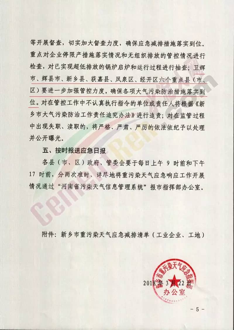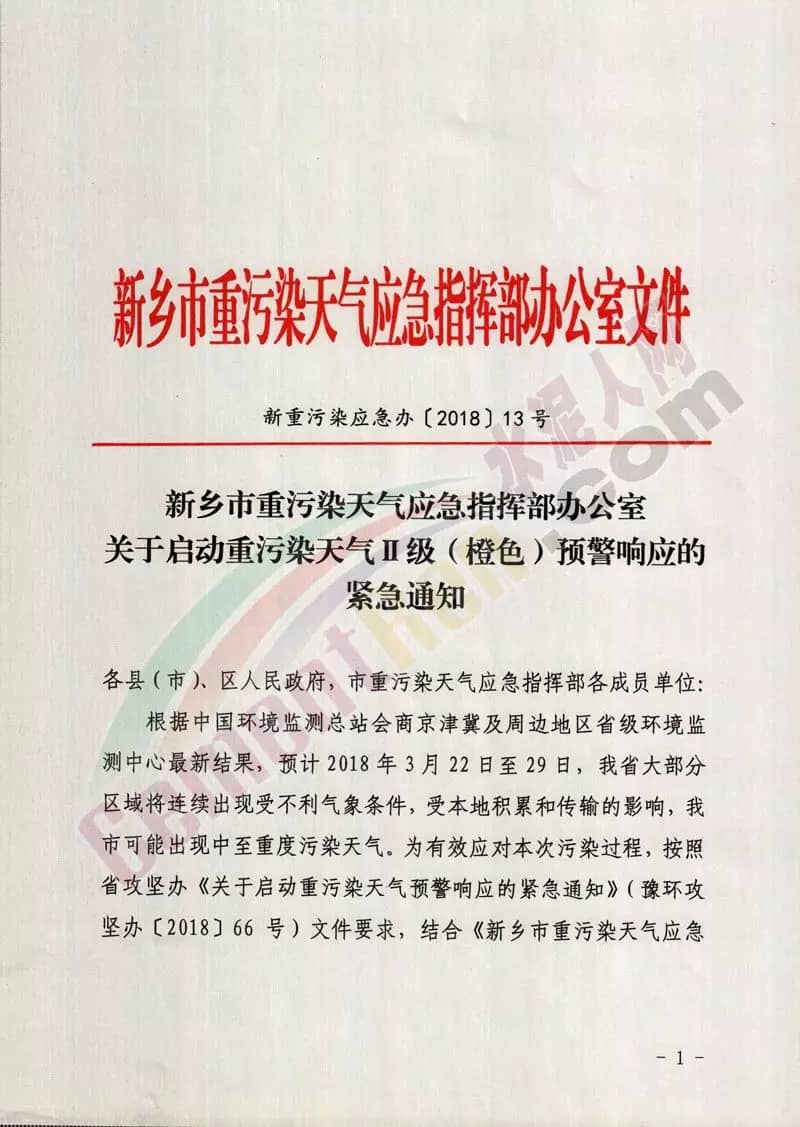 【水泥人網(wǎng)】水泥人網(wǎng)通訊員消息,3月22日河南新鄉(xiāng)市重污染天氣應急指揮部辦公室發(fā)布《關于啟動重污染天氣II級(橙色)預警響應的緊急通知》,通知稱,根據(jù)中國環(huán)境監(jiān)測總站會商京津冀及周邊地區(qū)省級環(huán)境監(jiān)測中心最新結果,預計2018年3月22日29日,河南省大部分區(qū)域將出現(xiàn)中至重度污染天氣,為有效應對本次污染過程,要求下屬水泥企業(yè)自2018年3月22日16時起啟動新鄉(xiāng)市重污染天氣II級(橙色)預警響應,預警解除時間根據(jù)臨近空氣質量預報結果進行調整。