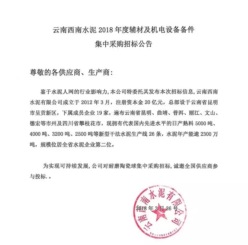 為了做好云南西南下屬19家成員企業(yè)2018年度生產(chǎn)用陶瓷耐磨球的招議標(biāo)采購工作,誠邀云南西南下屬19家成員企業(yè)的機(jī)電設(shè)備原制造供貨廠及其他同類制造企業(yè)參加,以滿足云南西南下屬成員企業(yè)生產(chǎn)的機(jī)電設(shè)備備件及輔助材料的需求,共同打造云南西南長期穩(wěn)定合作、互惠共贏的供應(yīng)商渠道?,F(xiàn)將相關(guān)招標(biāo)采購信息發(fā)布如下: