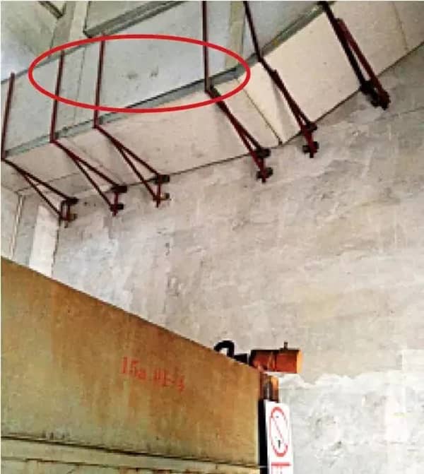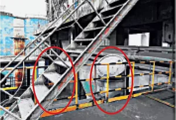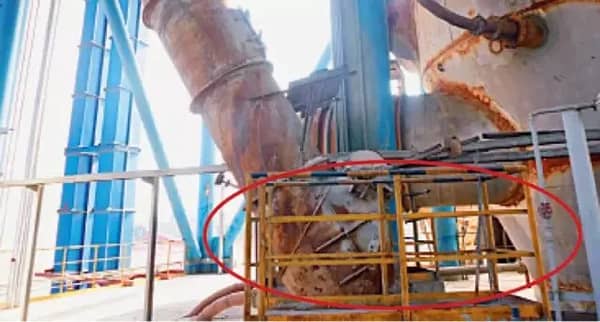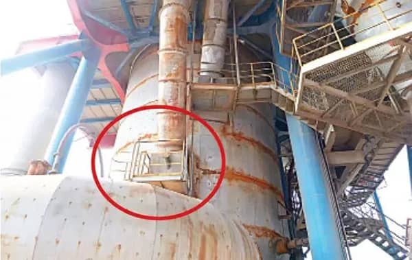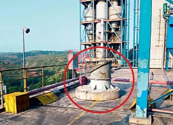2、水泥廠預(yù)熱器系統(tǒng)下料管清堵孔處用跳板搭設(shè)簡(jiǎn)易平臺(tái),無(wú)防墜落措施,無(wú)逃生通道。作業(yè)過程容易出現(xiàn)人員高處墜落傷害;如果出現(xiàn)熱物料異常噴出,作業(yè)人員無(wú)法逃離,還會(huì)造成熱物料的高溫灼燙傷害。