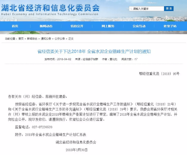 【水泥人網(wǎng)】日前,湖北省經(jīng)信委下發(fā)《關(guān)于2018年全省水泥企業(yè)錯(cuò)峰生產(chǎn)計(jì)劃的通知》,通知稱按照省經(jīng)信委、省環(huán)保廳《關(guān)于進(jìn)一步規(guī)范全省水泥行業(yè)錯(cuò)峰生產(chǎn)工作的通知》(鄂經(jīng)信重化〔2018〕21號(hào))和《關(guān)于全省水泥行業(yè)錯(cuò)峰生產(chǎn)工作的補(bǔ)充通知》(鄂經(jīng)信重化函〔2018〕39號(hào))要求,湖北省工信委會(huì)同省環(huán)保廳對(duì)相關(guān)市(州)審核上報(bào)的水泥企業(yè)2018年錯(cuò)峰生產(chǎn)備案計(jì)劃進(jìn)行了審定,編制了2018年全省水泥企業(yè)錯(cuò)峰生產(chǎn)計(jì)劃,并向社會(huì)公開(kāi)。