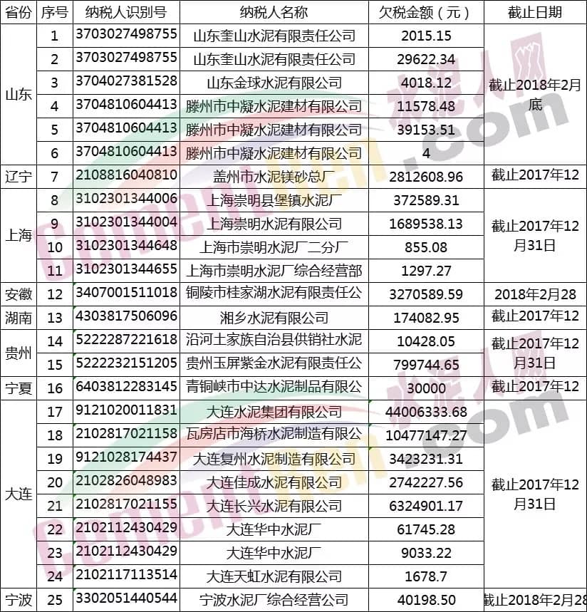 【水泥人網(wǎng)】近日,各省稅務(wù)部門對欠稅企業(yè)進(jìn)行了公示,部分水泥企業(yè)也出現(xiàn)欠稅的情況。據(jù)水泥人網(wǎng)統(tǒng)計,在各地稅務(wù)局公布的最新欠稅名單當(dāng)中,包括21家水泥企業(yè),欠稅金額達(dá)1842.8萬元。具體名單如下: