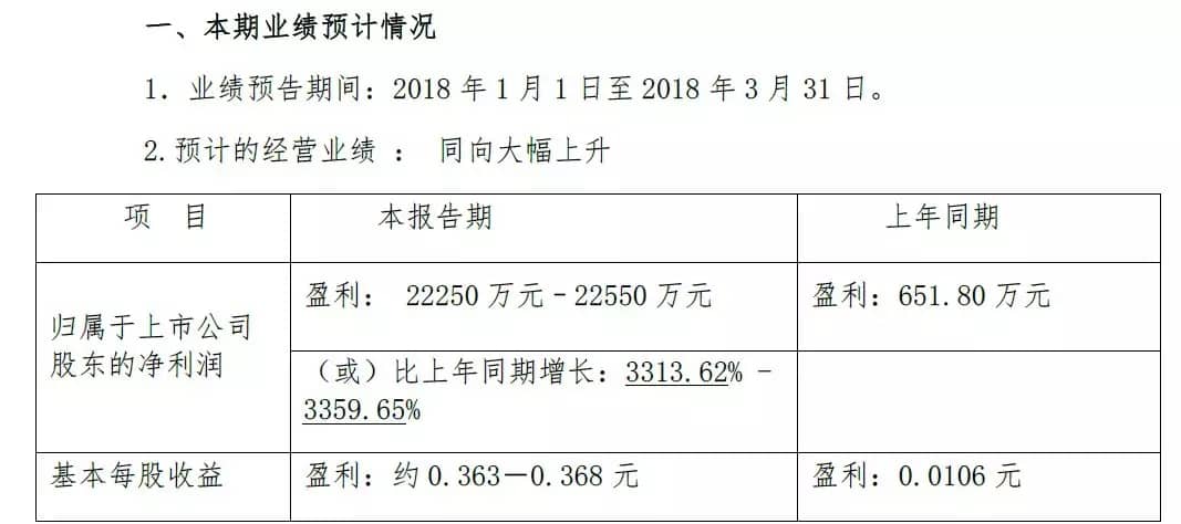 萬年青9日晚間發(fā)布2018年一季度業(yè)績預(yù)告,預(yù)計(jì)公司2018年1-3月凈利潤為2.23億元~2.26億元,上年同期為651.80萬元,同比增長33倍。