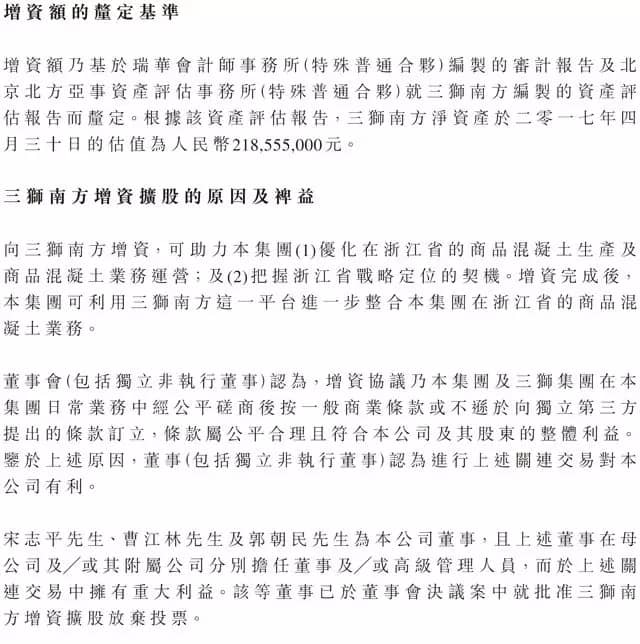 向三獅南方增資,可助力集團優(yōu)化在浙江省的商品混凝土生產(chǎn)及商品混凝土業(yè)務(wù)運營;及把握浙江省戰(zhàn)略定位的契機。增資完成后,集團可利用三獅南方這一平臺,進一步整合集團在浙江省的商品混凝土業(yè)務(wù)。