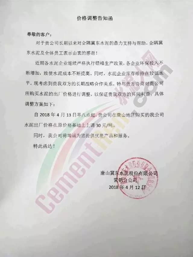 公司決定自今日(13日)早8點起,唐山地區(qū)水泥出廠價格在原價基礎(chǔ)上上調(diào)30元/噸。