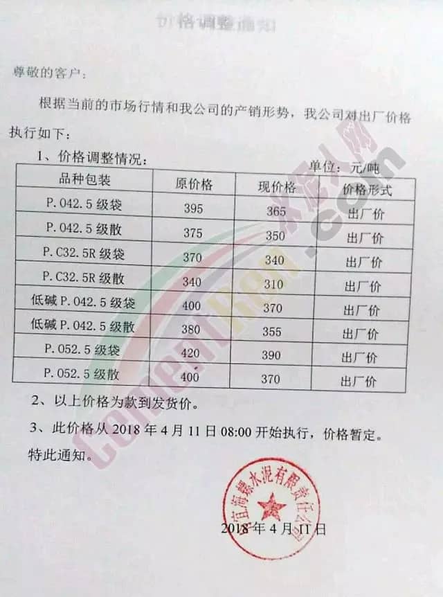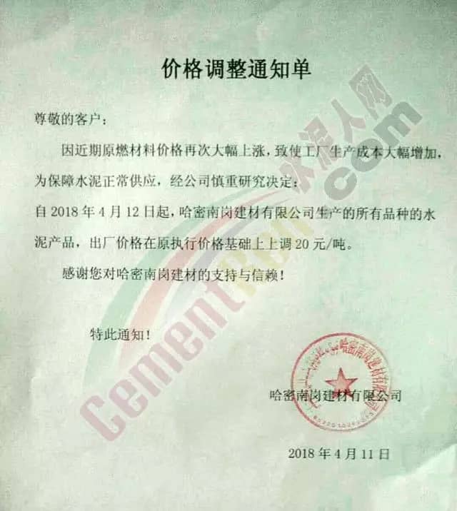4月11日,哈密南崗建材有限公司發(fā)布價格調(diào)整通知單表示,因近期原燃材料價格再次大幅上漲,致使工廠生產(chǎn)成本大幅增加,為保障水泥正常供應(yīng),經(jīng)公司研究決定自2018年4月12日起,哈密南崗建材有限公司生產(chǎn)的所有品種的水泥產(chǎn)品,出廠價格在原執(zhí)行價格基礎(chǔ)上上調(diào)20元/噸。