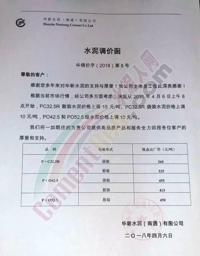 4月6日,華新水泥(南通)公司發(fā)布調(diào)價函,自即日起上調(diào)各標號水泥價格。其中PC32.5R散裝水泥上調(diào)15元/噸。PC32.5R袋裝水泥上調(diào)10元/噸。PO42.5和PO52.5級水泥價格上調(diào)10元/噸。調(diào)價后現(xiàn)金出廠價如下圖所示: