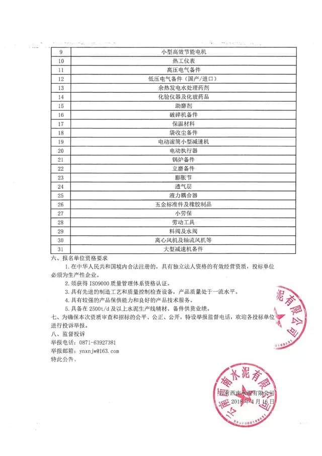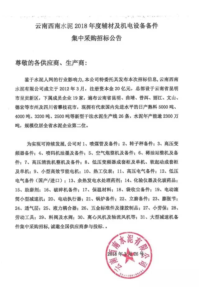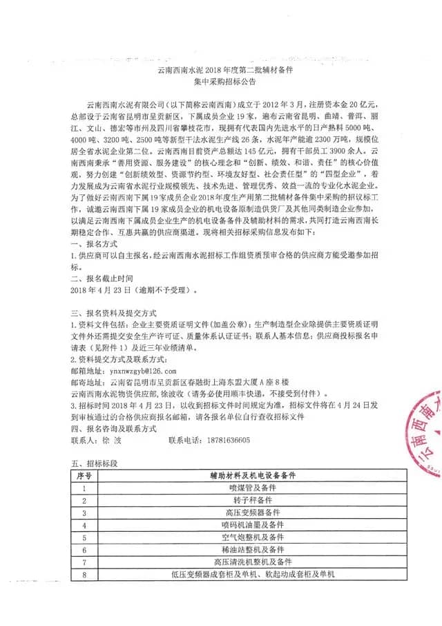 【水泥人網】鑒于水泥人網的行業(yè)影響力,本公司特委托其發(fā)布本次招標信息,云南西南水泥有限公司成立于2012年3月,注冊資本金20億元,總部設于云南省昆明市呈貢新區(qū),下屬成員企業(yè)19家,遍布云南省昆明、曲靖、普洱、麗江、文山、德宏等市州及四川省攀枝花市,現(xiàn)擁有代表國內先進水平的日產熟料5000噸、4000噸、3200噸、2500噸等新型干法水泥生產線26條,水泥年產能逾2300萬噸,規(guī)模位居全省水泥企業(yè)第二位。