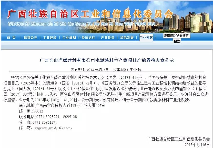 【水泥人網(wǎng)】日前,廣西壯族自治區(qū)工信委公布了《廣西合山虎鷹建材有限公司水泥熟料生產(chǎn)線項目產(chǎn)能置換方案》公示稱: 根據(jù)《國務院關于化解產(chǎn)能嚴重過剩矛盾的指導意見》(國發(fā)〔2013〕41號)、《國務院關于發(fā)布政府核準的投資項目目錄(2016年本)的通知》(國發(fā)〔2016〕72號)、《國務院辦公廳關于促進建材工業(yè)穩(wěn)增長調結構增效益的指導意見》(國辦發(fā)〔2016〕34號)以及《工業(yè)和信息化部關于印發(fā)鋼鐵水泥玻璃行業(yè)產(chǎn)能置換實施辦法的通知》(工信部原〔2017〕337號)精神,對廣西合山虎鷹建材有限公司水泥熟料生產(chǎn)線項目產(chǎn)能置換方案進行公示,歡迎社會公眾進行監(jiān)督。公示期為2018年4月16日—4月23日,公示期7天。公示原文如下: