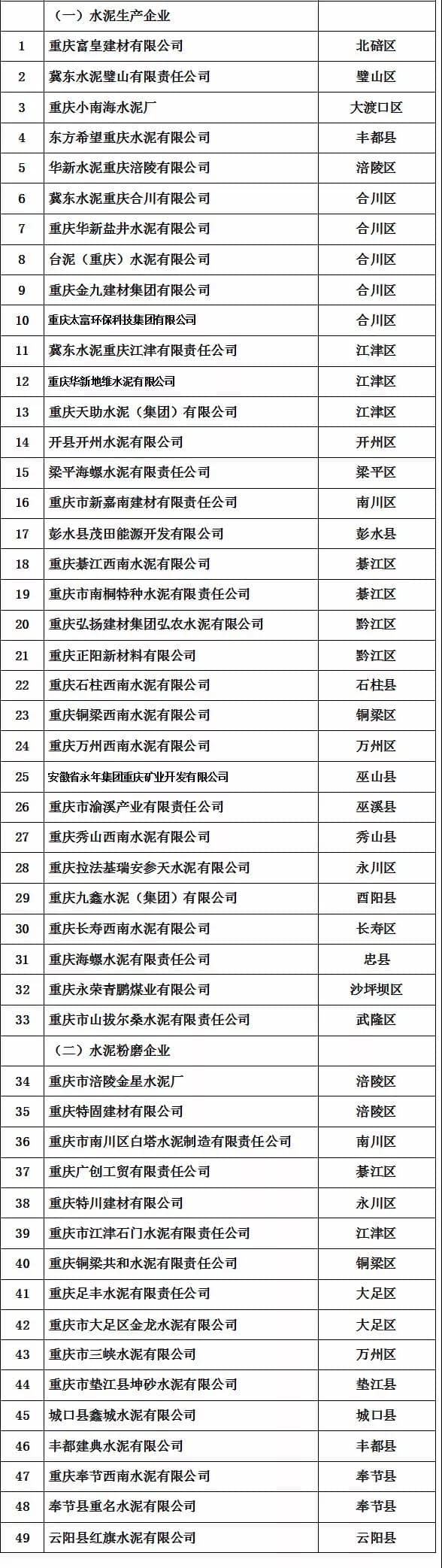 重慶市水泥等高耗能行業(yè)專項監(jiān)察企業(yè)名單