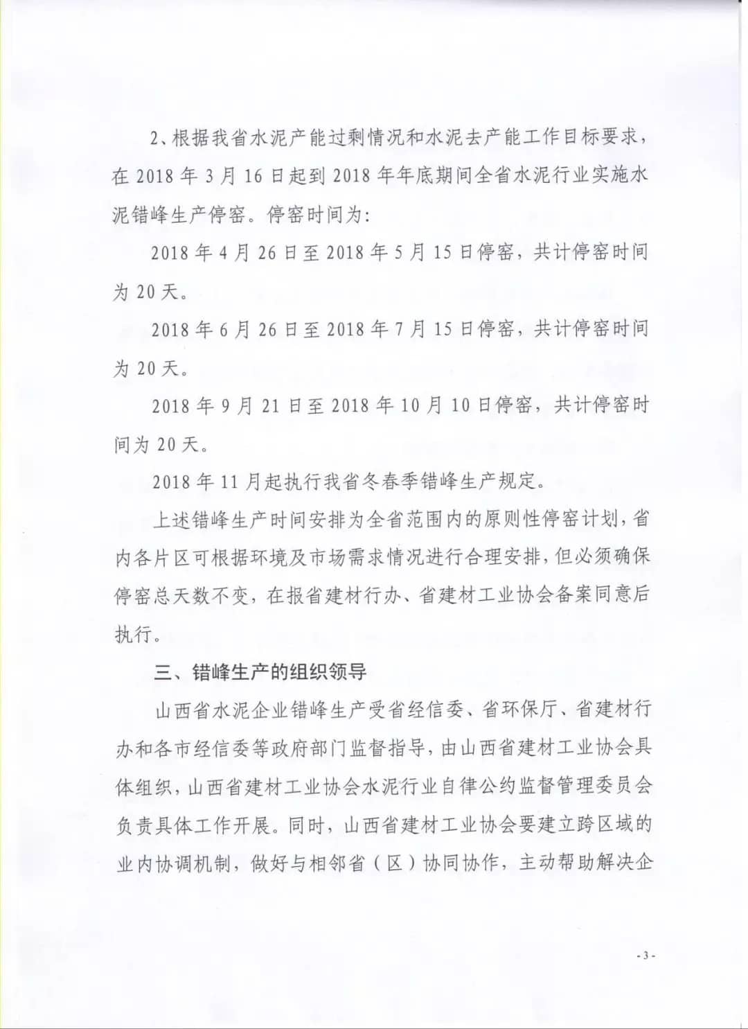 【水泥人網(wǎng)】據(jù)水泥人網(wǎng)了解,山西省根據(jù)產(chǎn)能過剩實(shí)際情況和水泥去產(chǎn)能工作目標(biāo)的要求,在2018年3月16日起到2018年年底期間全省水泥行業(yè)實(shí)施錯(cuò)峰生產(chǎn)停窯,停窯時(shí)間為:
