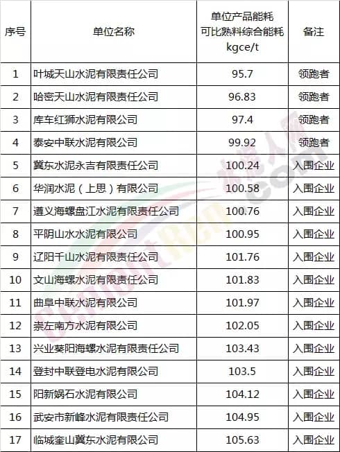 其中,入選能效“領(lǐng)跑者”名單的有四家企業(yè),分別為葉城天山水泥有限責(zé)任公司、哈密天山水泥有限責(zé)任公司、庫車紅獅水泥有限公司、泰安中聯(lián)水泥有限公司。入圍企業(yè)共13家企業(yè),分別為冀東水泥永吉有限責(zé)任公司、華潤水泥(上思)有限公司、遵義海螺盤江水泥有限責(zé)任公司、平陰山水水泥有限公司、遼陽千山水泥有限責(zé)任公司、文山海螺水泥有限責(zé)任公司、曲阜中聯(lián)水泥有限公司、崇左南方水泥有限公司、興業(yè)葵陽海螺水泥有限責(zé)任公司、登封中聯(lián)登電水泥有限公司、陽新媧石水泥有限公司、武安市新峰水泥有限責(zé)任公司、臨城奎山冀東水泥有限公司。