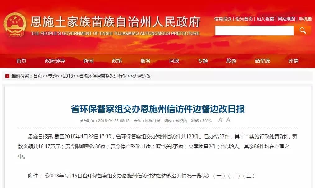截至2018年4月22日17:30,湖北省環(huán)保督察組交辦恩施州信訪件共123件。已辦結(jié)37件,其中:實(shí)施行政處罰7家,罰款金額共16.17萬元;責(zé)令限期整改36家;責(zé)令停產(chǎn)整改11家;取締關(guān)閉5家;立案偵查2件;約談9人。其余86件均在辦理之中。