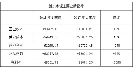2018年一季度,雖然冀東水泥核心區(qū)域水泥市場(chǎng)秩序持續(xù)改善,水泥及熟料銷(xiāo)售價(jià)格同比上漲20%左右,毛利率和營(yíng)業(yè)收入同比增加,但是因受錯(cuò)峰生產(chǎn)及環(huán)保限產(chǎn)政策、核心區(qū)域水泥市場(chǎng)需求下滑等因素的影響,導(dǎo)致冀東水泥水泥產(chǎn)量同比降低約17%,停工費(fèi)用增加,歸屬于上市公司股東的凈利潤(rùn)虧損同比增加。
