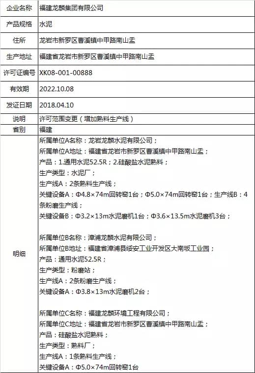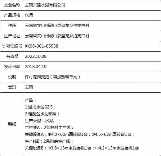 以上涉及項目變更及許可范圍變更的企業(yè)中,新增熟料單元及熟料生產(chǎn)線的有兩家企業(yè),分別為云南興建水泥有限公司、福建龍麟集團(tuán)有限公司。其生產(chǎn)許可證詳細(xì)如下:
