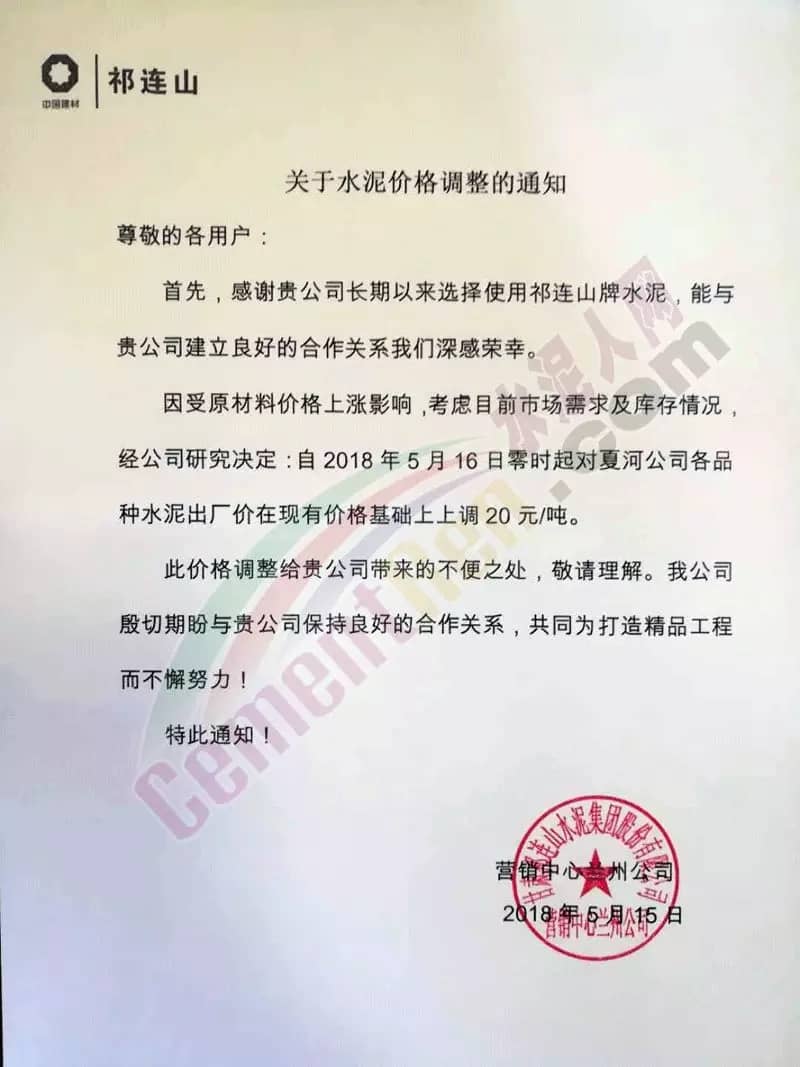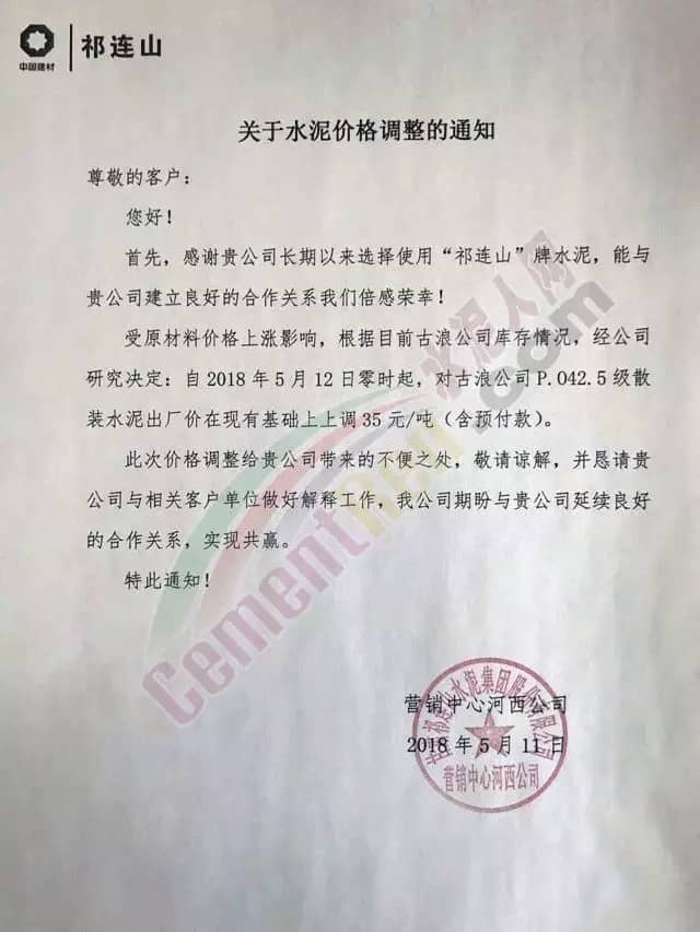 同是這家集團企業(yè),曾在12日零時針對古浪祁連山水泥上調(diào)價格。主要是針對P.O42.5散裝水泥在原執(zhí)行價格基礎(chǔ)上上調(diào)35元/噸(含預(yù)付款)。