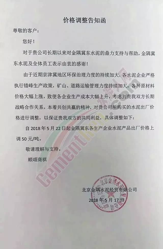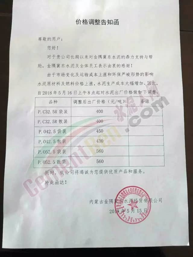 5月16日內(nèi)蒙古自治區(qū)呼和浩特市區(qū)域主導(dǎo)企業(yè)上調(diào)水泥價(jià)格同時(shí)包頭冀東金隅水泥也發(fā)通知上調(diào)水泥價(jià)格。