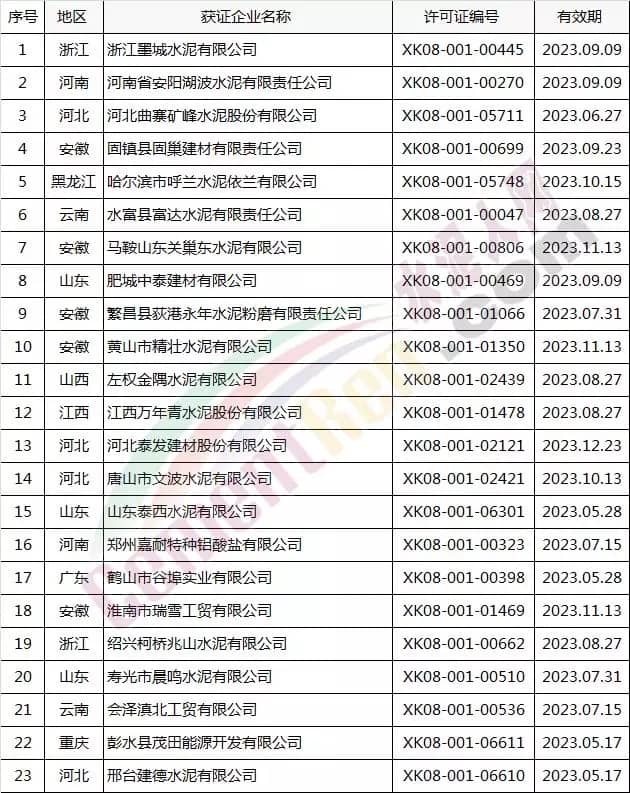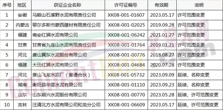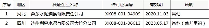 本次發(fā)放的水泥生產(chǎn)企業(yè)許可證包括新發(fā)證1家;說(shuō)明為其他和其他(兼并重組)的共兩家企業(yè);名稱及許可范圍變更的10家企業(yè),到期延續(xù)的23家企業(yè)。