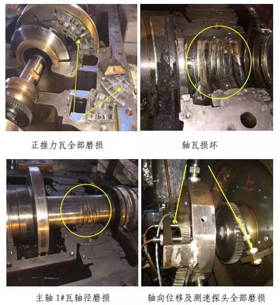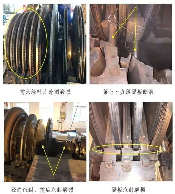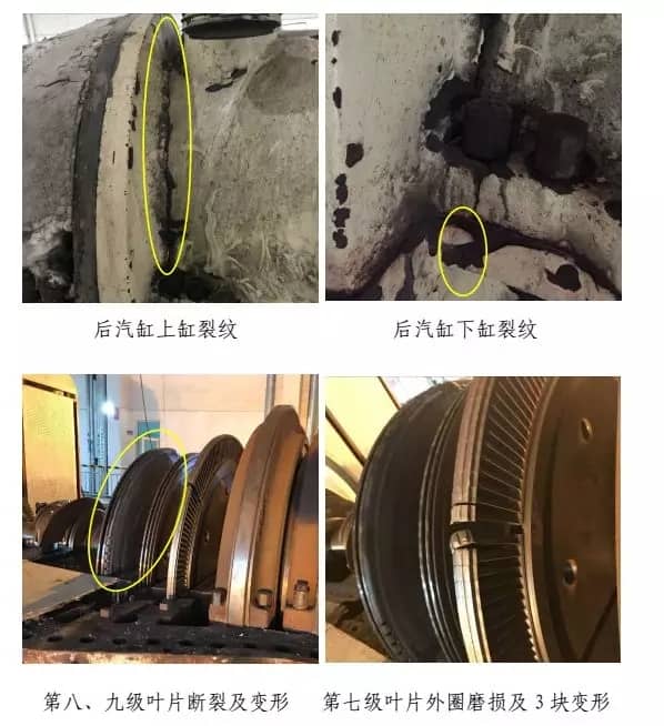 經(jīng)檢查,汽輪機后缸上、下缸體開裂,第八、九級葉片全部脫落,第七級葉片外圈磨損及 3塊變形,前六級葉片外圈磨損,第七~九級隔板斷裂,隔板汽封、徑向汽封、前后汽封全部磨損,主油泵小軸斷裂及油封環(huán)磨損,主油泵擋油環(huán)斷裂,正推力瓦全部磨損,1#~4#瓦損壞,主軸1#、2#瓦軸徑磨損,軸向位移及測速探頭全部磨損,汽輪機側(cè)聯(lián)軸器及齒輪位移,盤車電機殼體斷裂,勵磁機定轉(zhuǎn)子摩擦損壞,整流盤連接線斷裂及風(fēng)扇葉片磨損,凝汽器約20根銅管受損,發(fā)電機轉(zhuǎn)子需返廠檢修測試。