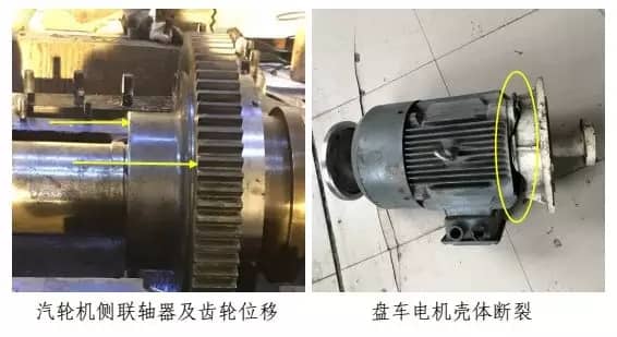 22:40分,公司領(lǐng)導(dǎo)到達現(xiàn)場,組織人員對現(xiàn)場采取保護和應(yīng)急處置?;謴?fù)供電后,對 1#機組進行了初步檢查,發(fā)現(xiàn)排氣缸開裂,安全閥沖開,勵磁機端蓋脫落,手動盤車無法盤動等。在安排專人現(xiàn)場監(jiān)控后向區(qū)域?qū)I(yè)組領(lǐng)導(dǎo)、股份公司相關(guān)部室人員進行了匯報。