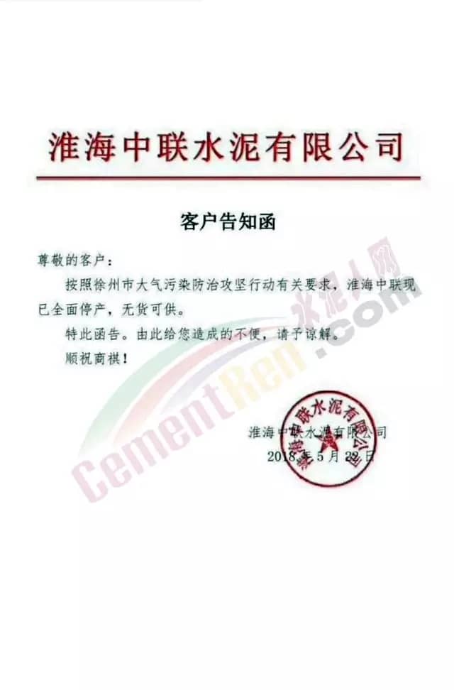 【水泥人網(wǎng)】5月22日淮海中聯(lián)水泥有限公司發(fā)布客戶告知函稱,按照徐州市大氣污染攻堅行動有關(guān)要求,淮海中聯(lián)現(xiàn)已全面停產(chǎn),無貨可供。