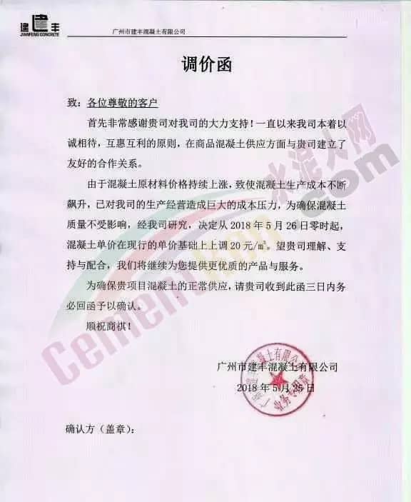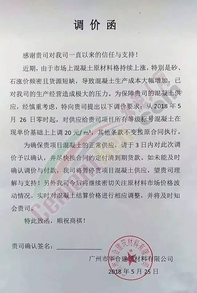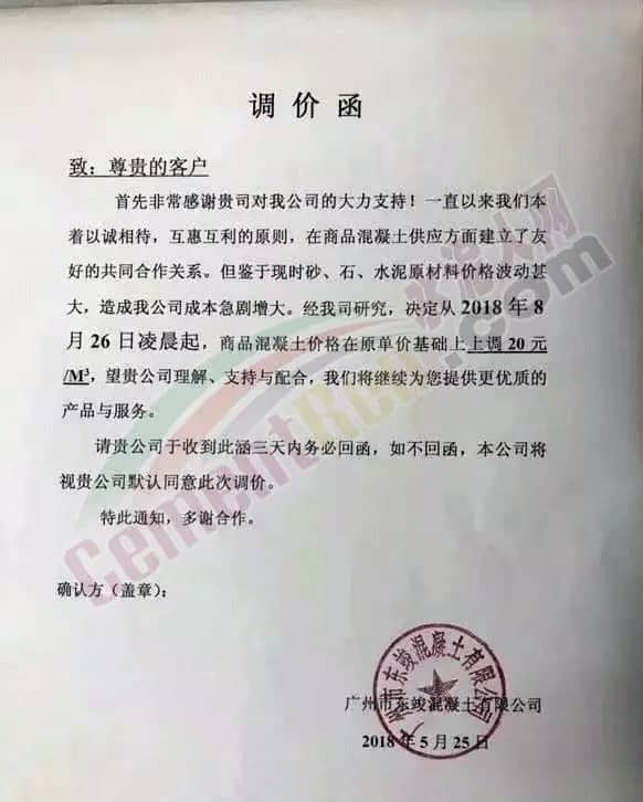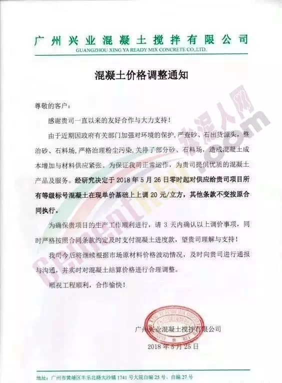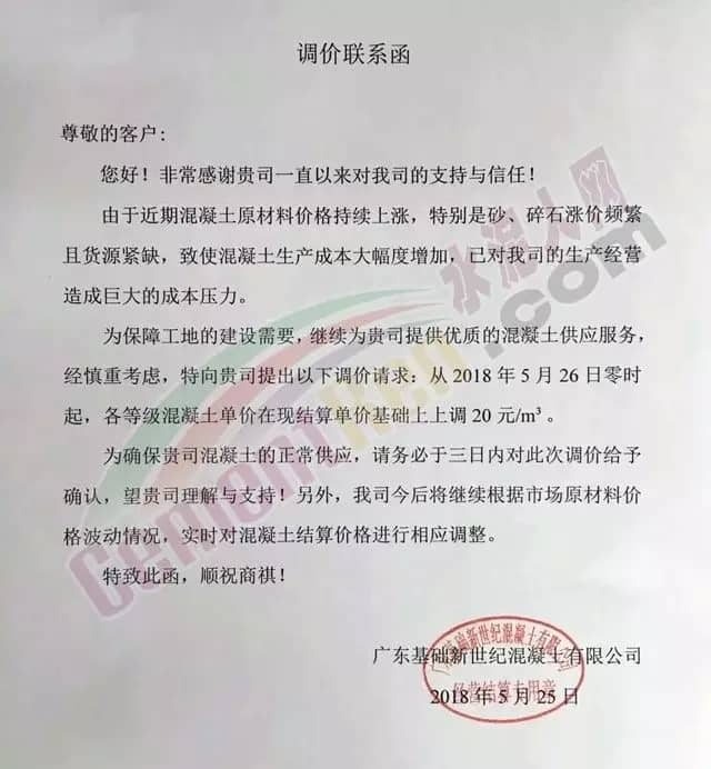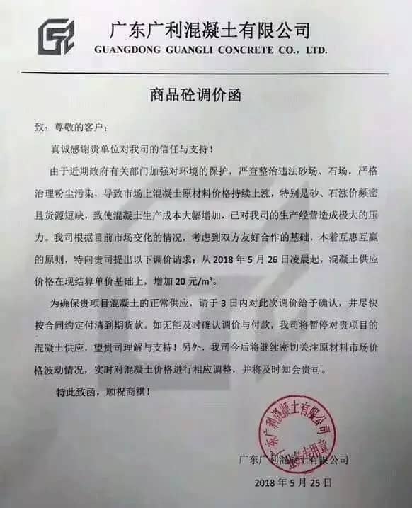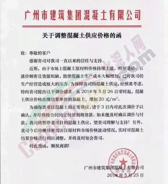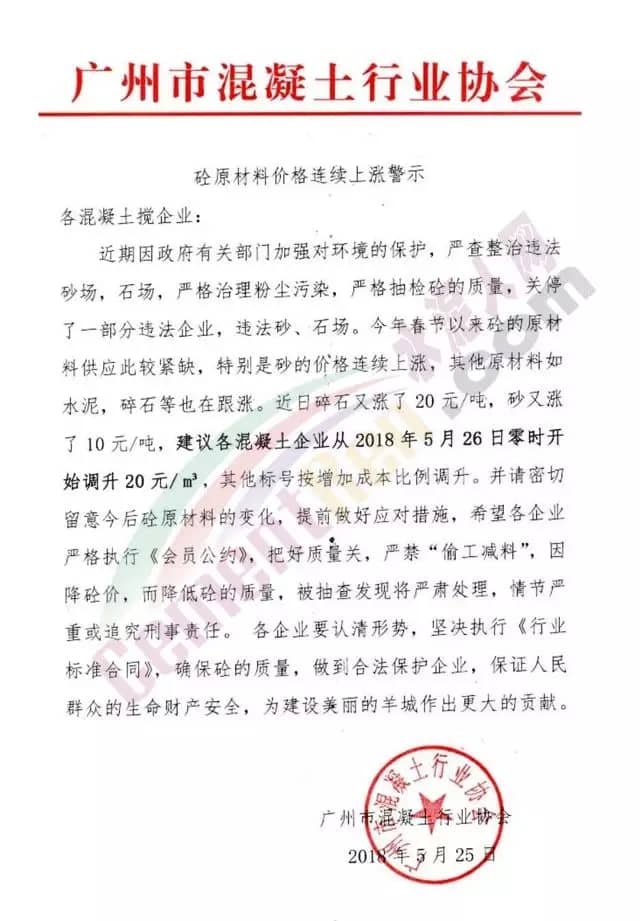 近日碎石又漲了20元/噸,砂又漲了10元/噸。建議各混凝土企業(yè)從2018年5月26日零時(shí)開始調(diào)升20元/立方。其他標(biāo)號(hào)按增加成本比例調(diào)升。并請(qǐng)密切留意今后砼原材料的變化,提前做好應(yīng)對(duì)措施。