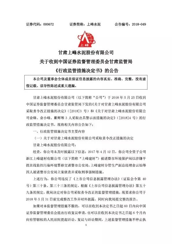 【水泥人網(wǎng)】上峰水泥28日早間公告,公司于5月25日收到中國證券監(jiān)督管理委員會甘肅監(jiān)管局下發(fā)的《關(guān)于對甘肅上峰水泥股份有限公司采取責(zé)令改正措施的決定》([2018]3號)和《關(guān)于對甘肅上峰水泥股份有限公司俞鋒、俞小峰、瞿輝等3人采取出具警示函措施的決定》([2018]4號)的行政監(jiān)管措施決定書。