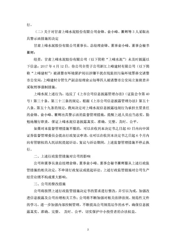 決定書稱,監(jiān)管關(guān)注到,公司未披露以下信息,即公司全資子公司浙江上峰建材有限公司(以下簡稱“上峰建材”)被諸暨市環(huán)境保護(hù)局以涉嫌干擾在線監(jiān)控污染環(huán)境罪移交諸暨市公安局,上峰建材分管生產(chǎn)副總經(jīng)理俞云燦等四人被諸暨市公安局立案偵查并采取刑事強(qiáng)制措施。甘肅監(jiān)管局同時決定對上峰水泥信披違規(guī)行為承擔(dān)主要責(zé)任的俞鋒、俞小峰、瞿輝出具警示函的監(jiān)督管理措施。