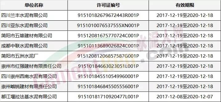 來(lái)自于全國(guó)排污許可證管理信息平臺(tái)公開端的數(shù)據(jù)顯示,成都市截止目前取得排污許可證的水泥企業(yè)共9家,名單如下: