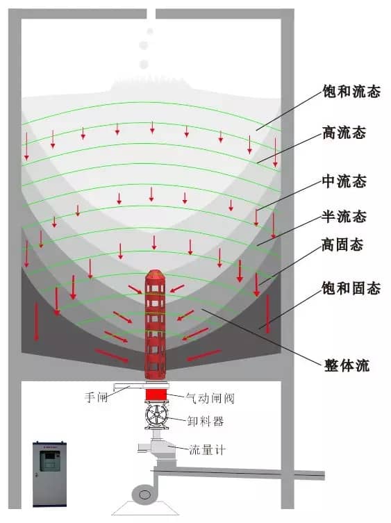 我們發(fā)現(xiàn),庫(kù)底出口存在的收縮拱是造成粉體順利卸出的關(guān)鍵障礙,從而精巧發(fā)明設(shè)計(jì)出無(wú)動(dòng)力太極錐裝置。該裝置充分利用庫(kù)內(nèi)粉體料重高位勢(shì)能為原動(dòng)力,通過(guò)置于庫(kù)內(nèi)出口上方的太極錐針對(duì)性鋼結(jié)構(gòu)設(shè)計(jì),形成了自然剪切力破解粉體收縮運(yùn)動(dòng)的拱阻作用;并確保形成最底層硬固料優(yōu)先卸除的自動(dòng)平衡安排,使庫(kù)內(nèi)千百噸粉料重力勢(shì)能形成前拉后推的整體作用于庫(kù)壁,實(shí)現(xiàn)了無(wú)動(dòng)力無(wú)死區(qū)自然整體流卸料;而且其力學(xué)分布作用與庫(kù)壁密度分布正好形成自動(dòng)糾偏的平衡反饋機(jī)制,最終達(dá)成大庫(kù)邊運(yùn)行卸放邊自我清理庫(kù)壁的理想作用(如圖三)。即便庫(kù)頂因雨天產(chǎn)生少量滲漏,也會(huì)被流動(dòng)性粉料迅速消化移除,徹底排除死料形成及其惡性生長(zhǎng)的溫床。由于無(wú)需吹入空氣,不但大幅節(jié)能降噪,半流動(dòng)性還有利于后續(xù)機(jī)械實(shí)現(xiàn)流量自適應(yīng)穩(wěn)定卸放控制。同時(shí),針對(duì)不同庫(kù)位等復(fù)雜工況配套設(shè)計(jì)了專用卸料裝置和高精度沖板流量計(jì),以及量身定制的智能反饋電腦控制驅(qū)動(dòng)系統(tǒng),構(gòu)成了完整的綠色智能水泥卸放閉環(huán)控制系統(tǒng)粉流掣,能接入中控進(jìn)行數(shù)字遠(yuǎn)程定量控制卸放(如圖四)。