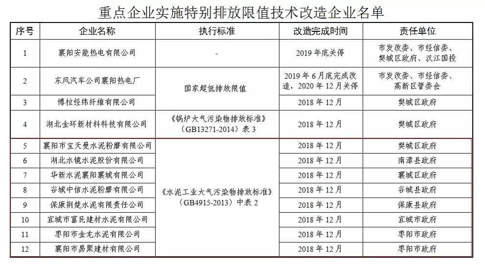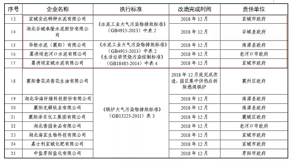 重點(diǎn)企業(yè)實(shí)施特別排放限值技術(shù)改造企業(yè)名單中包括多家水泥企業(yè),改造執(zhí)行標(biāo)準(zhǔn)為《水泥工業(yè)大氣污染物排放標(biāo)準(zhǔn)》(GB4915-2013)中表2。改造完成時(shí)間為2018年12月。