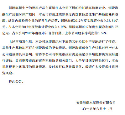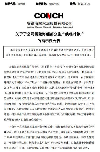 海螺水泥(600585)12日晚公告,全資子公司銅陵海螺收到通知,由于銅陵海螺碼頭處于當(dāng)?shù)厮畯S取水口二級(jí)保護(hù)區(qū)范圍內(nèi),將據(jù)生態(tài)環(huán)境部等下發(fā)文件予以清理整治。