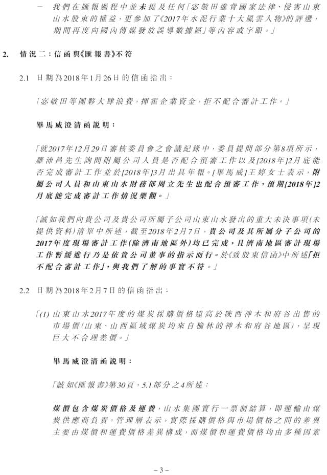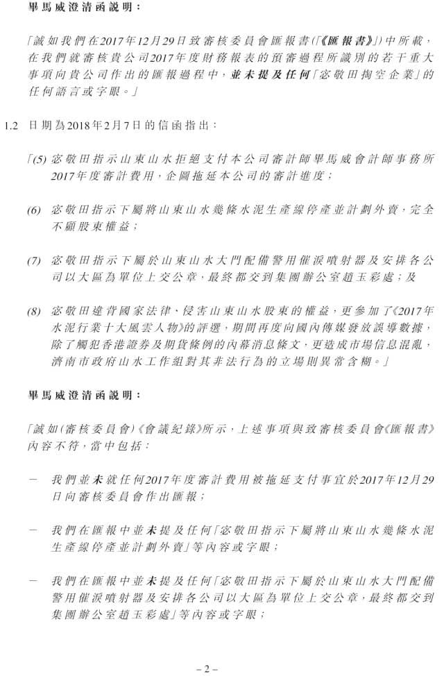 畢馬威進(jìn)一步表明,公司發(fā)布的公告與該會計(jì)師事務(wù)所在2017年12月29日向公司審核委員會作出的《匯報(bào)書》存在不一致,畢馬威曾在2018年3月8日向當(dāng)時(shí)公司董事會和審核委員會發(fā)出了澄清函,但這份澄清函并未對外公布。當(dāng)時(shí),山水水泥董事會一直由公司第一大股東天瑞集團(tuán)提名人員占據(jù)。