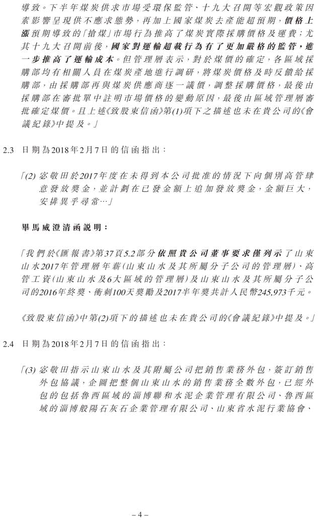 對于“將銷售業(yè)務(wù)外包、致企業(yè)于死地”,畢馬威澄清,該事務(wù)所在匯報(bào)中的實(shí)際說法是:“銷售平臺是山東山水與附屬公司與行業(yè)內(nèi)聯(lián)合成立的協(xié)同市場價(jià)格的平臺組織,各自企業(yè)的銷售業(yè)務(wù)仍由各自企業(yè)銷售人員負(fù)責(zé)。”并不是上述 《致股東函》中所述的“銷售業(yè)務(wù)外包”。
