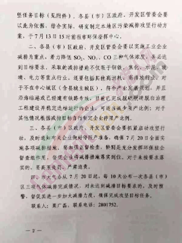 三、各縣(市)區(qū)政府、開發(fā)區(qū)管委會要抓緊啟動攻堅行動,及時通知有關全業(yè)做好停限產(chǎn)準備,確保7月20日全面實施各項減排措施。要加強監(jiān)督檢查,特別是充分發(fā)揮環(huán)保駐企業(yè)督察組作用,督促企業(yè)將減排措施落實到位,對于未按照要求落實的,要高限處罰、嚴肅追責。