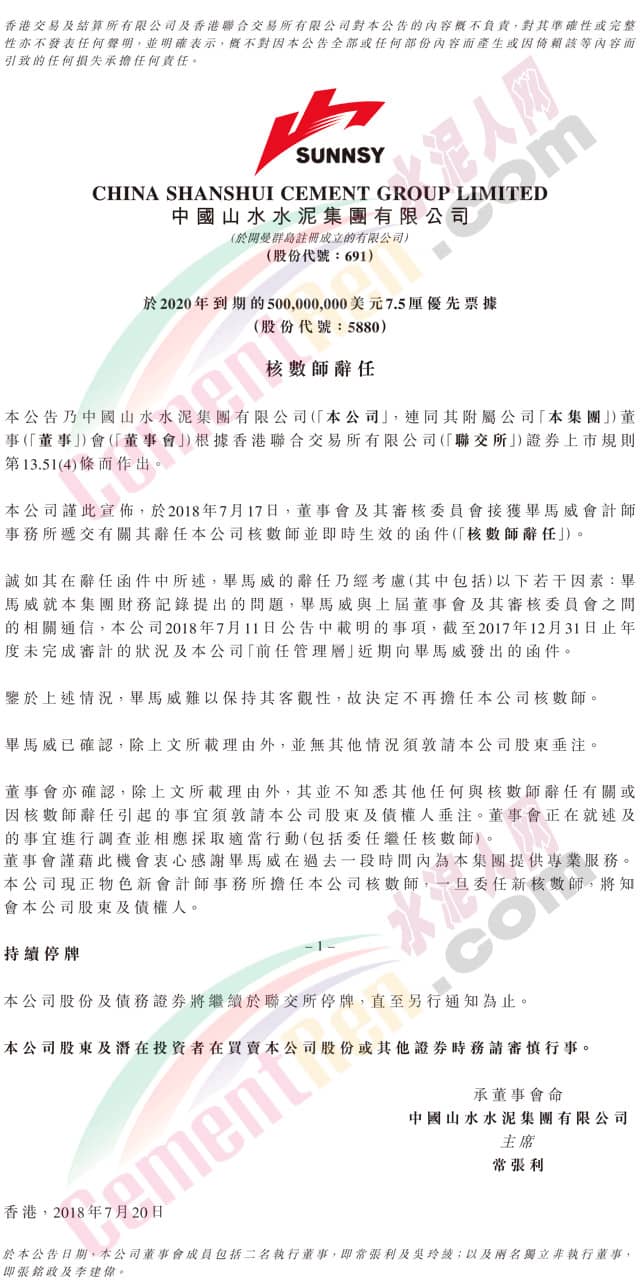 【水泥人網(wǎng)】山水水泥(00691.HK)宣布,于2018年7月17日,董事會及審核委員會接獲畢馬威會計師事務(wù)所遞交有關(guān)辭任公司核數(shù)師并即時生效的函件。