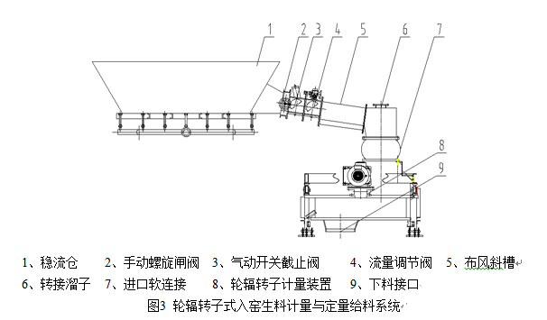 存儲(chǔ)在穩(wěn)流倉(cāng)1中的生料粉在倉(cāng)底充氣助卸并結(jié)合倉(cāng)側(cè)充氣破拱的幫助下卸出,通過(guò)手動(dòng)螺旋閘閥2、氣動(dòng)開(kāi)關(guān)截止閥3、流量調(diào)節(jié)閥4和布風(fēng)斜槽5組成的預(yù)給料系統(tǒng)進(jìn)入輪輻轉(zhuǎn)子計(jì)量裝置8,生料粉在輪輻轉(zhuǎn)子的帶動(dòng)下,由進(jìn)料點(diǎn)經(jīng)過(guò)稱重區(qū)帶到出料點(diǎn)9,進(jìn)入下級(jí)輸送裝置(圖3所示)。采用預(yù)給料的粗調(diào)環(huán)節(jié),串級(jí)一個(gè)定量計(jì)量的精調(diào)環(huán)節(jié),將計(jì)量與控制在輸出時(shí)合二為一的雙閉環(huán)調(diào)節(jié)系統(tǒng),提高了系統(tǒng)的計(jì)量精度和穩(wěn)定性。