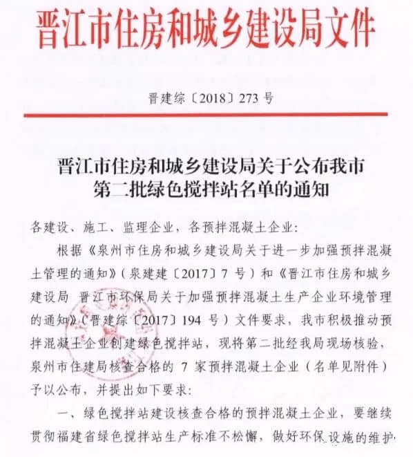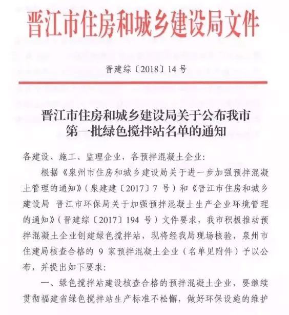 晉江市住建局在公布第二批綠色攪拌站名站通知時(shí)提出幾點(diǎn)要求: