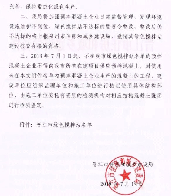2018年初,福建晉江市住建局公布第一批綠色攪拌站名單時(shí)提出要求,自2018年1月1日起,不在綠色攪拌站名單內(nèi)的預(yù)拌混凝土企業(yè)將不得向晉江市政府投資項(xiàng)目提供預(yù)拌混凝土。2018年7月1日起,不在晉江市綠色攪拌站名單內(nèi)的預(yù)拌混凝土企業(yè)不得向全市所有在建項(xiàng)目供應(yīng)預(yù)拌混凝土。