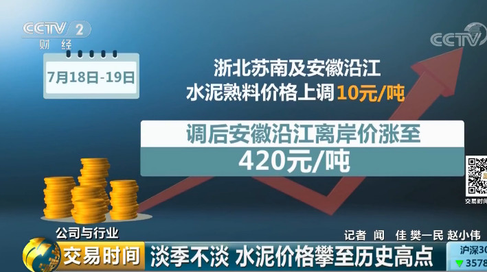 上海南方水泥有限公司營銷總監(jiān) 許昌良:目前,在整個上海南方的平均銷價在400塊錢左右,上漲了20%到30%左右,也是近十年來水泥運行價格最高的一年。