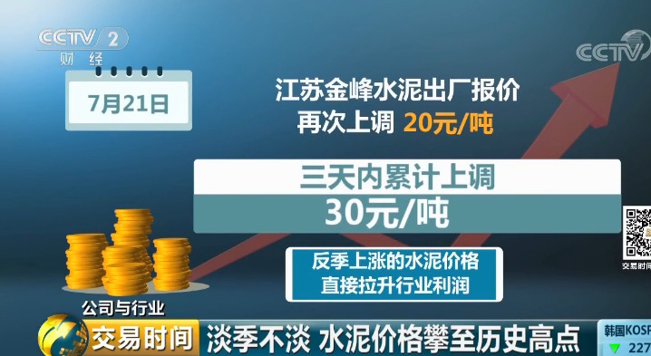 7月21日,江蘇金峰水泥出廠報價再次上調(diào)20元/噸,三天內(nèi)累計上調(diào)30元/噸,領漲區(qū)域市場。反季上漲的水泥價格,也直接拉升了行業(yè)利潤。