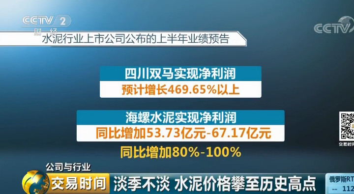 四川雙馬上半年實現(xiàn)凈利潤預計增長469.65%以上。海螺水泥上半年實現(xiàn)凈利同比增加53.73億元-67.17億元人民幣,同比增加80%-100%。