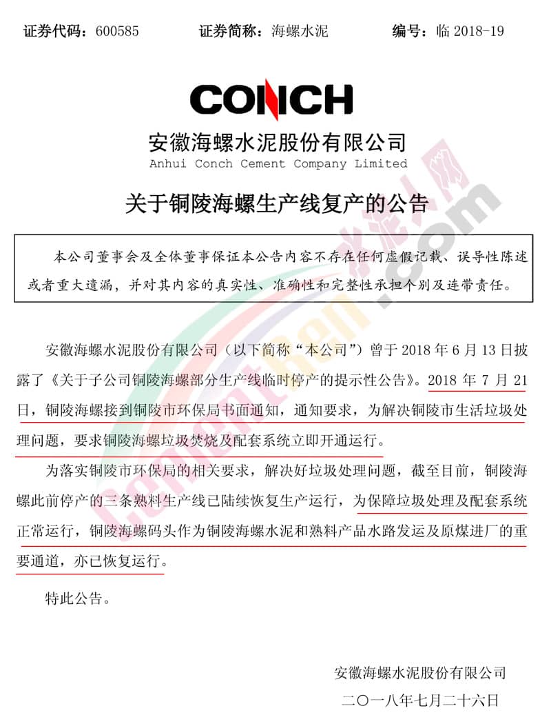 海螺水泥(00914)公告,2018年7月21日,銅陵海螺接到銅陵市環(huán)保局書面通知,通知要求,為解決銅陵市生活垃圾處理問(wèn)題,要求銅陵海螺垃圾焚燒及配套系統(tǒng)立即開(kāi)通運(yùn)行。