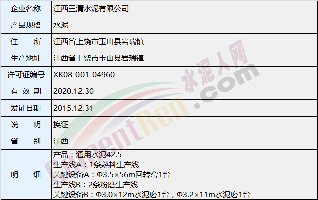 據(jù)質(zhì)監(jiān)總局生產(chǎn)許可證辦公室數(shù)據(jù)顯示,江西三清水泥有限公司生產(chǎn)地址位置江西省上饒市玉山縣巖瑞鎮(zhèn),原生產(chǎn)線規(guī)模為一條熟料生產(chǎn)線,關(guān)鍵設(shè)備為Φ3.5×56m回轉(zhuǎn)窯1臺(tái)。兩條水泥粉磨生產(chǎn)線,關(guān)鍵設(shè)備為Φ3.0×12m水泥磨1臺(tái),Φ3.2×11m水泥磨1臺(tái)。