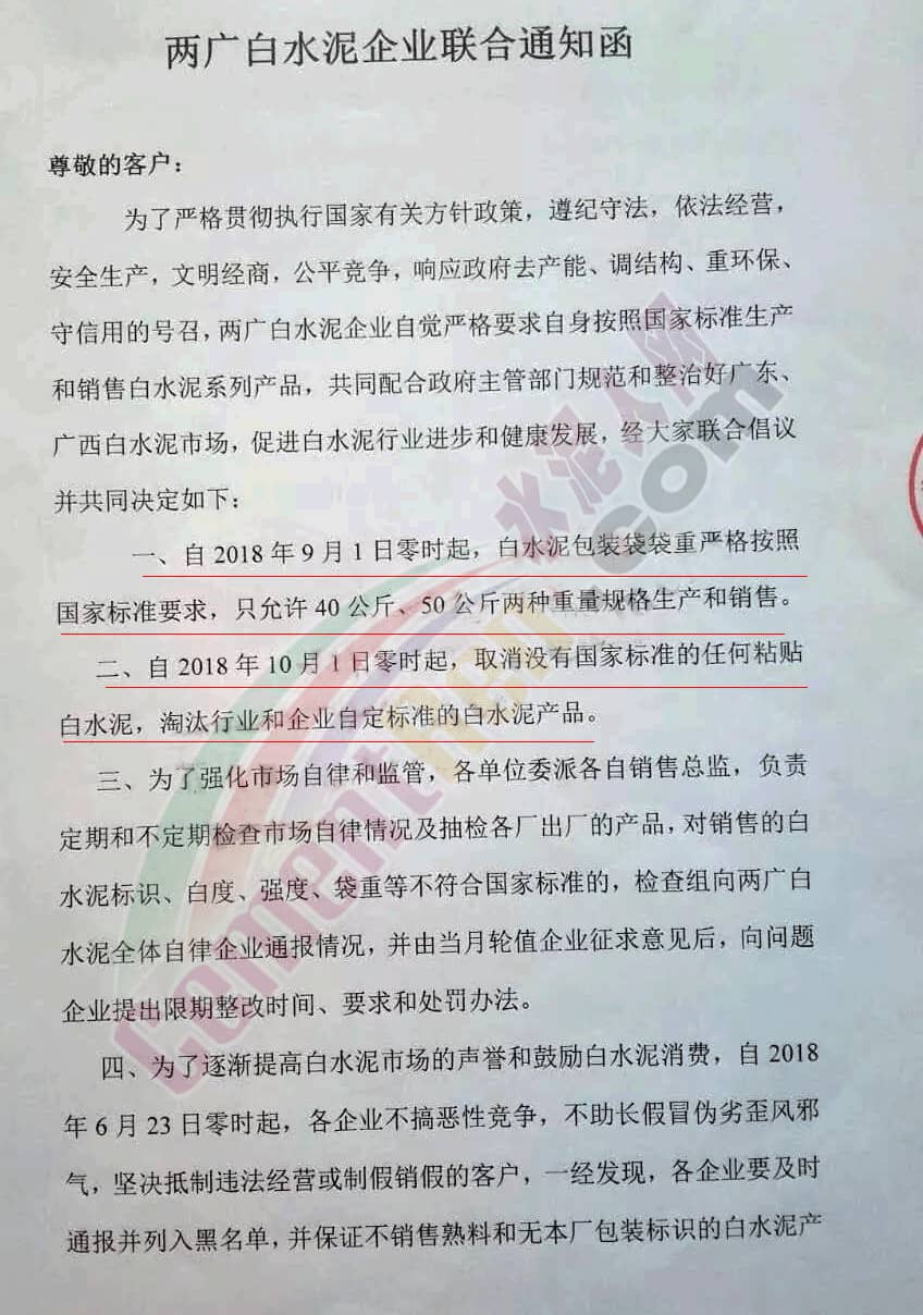 二、自2018年10月1日零時(shí)起,取消沒有國家標(biāo)準(zhǔn)的任何粘貼白水泥、淘汰行業(yè)和企業(yè)自定標(biāo)準(zhǔn)的白水泥產(chǎn)品。