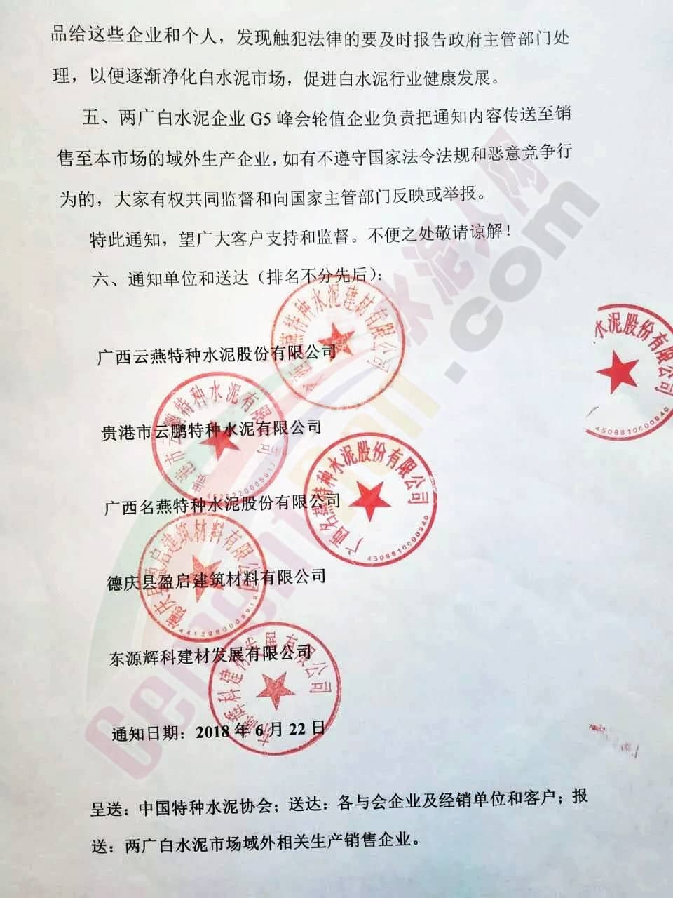 五、兩廣白水泥企業(yè)G5峰會(huì)輪值企業(yè)負(fù)責(zé)把通知內(nèi)容傳送至銷售至本市場的域外生產(chǎn)企業(yè),如有不遵守國家法令法規(guī)和惡意競爭行訓(xùn)的,大家有權(quán)共同監(jiān)督和向國家主管部門反映或舉報(bào)。