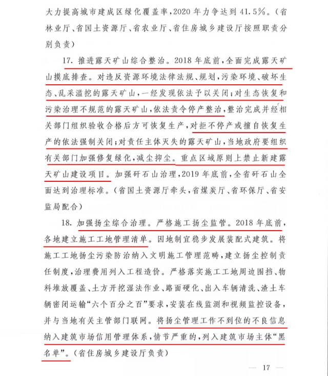 推進(jìn)露天礦山綜合整治,2018年底前,全面完成露天礦山摸底排查。對(duì)違反資源環(huán)境法律法規(guī)、規(guī)劃,污染環(huán)境、破壞生態(tài)、亂采濫亂的露天礦山,一經(jīng)發(fā)現(xiàn)依法予以關(guān)閉;對(duì)生態(tài)恢復(fù)和污染治理不規(guī)范的露天礦山,依法責(zé)令停產(chǎn)整治。對(duì)拒不停產(chǎn)或擅自恢復(fù)生產(chǎn)的依法強(qiáng)制關(guān)閉,對(duì)責(zé)任主體滅失的露天礦山,當(dāng)?shù)卣M織有關(guān)部門(mén)加強(qiáng)修復(fù)綠化,減塵抑塵。重點(diǎn)區(qū)域原則上禁止新建露天礦山建設(shè)項(xiàng)目。