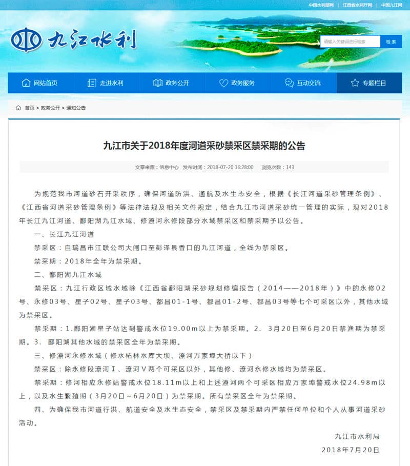 通知中指出為規(guī)范九江市河道砂石開采秩序,確保河道防洪、通航及水生態(tài)安全,根據(jù)《長江河道采砂管理條例》、《江西省河道采砂管理條例》等法律法規(guī)及相關(guān)文件規(guī)定,結(jié)合九江市河道采砂統(tǒng)一管理的實際,現(xiàn)對2018年長江九江河道、鄱陽湖九江水域、修潦河永修段部分水域禁采區(qū)和禁采期予以公告。